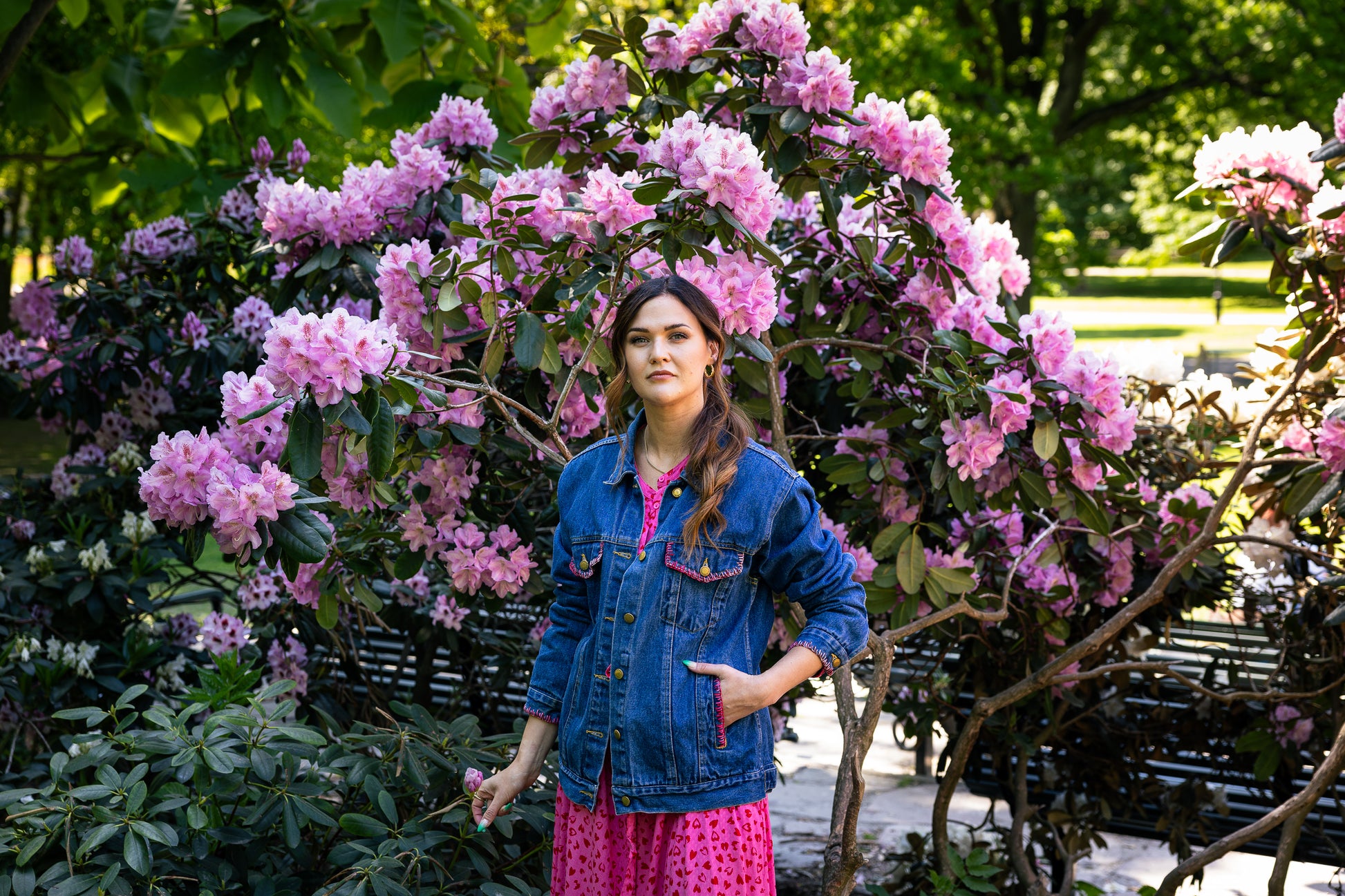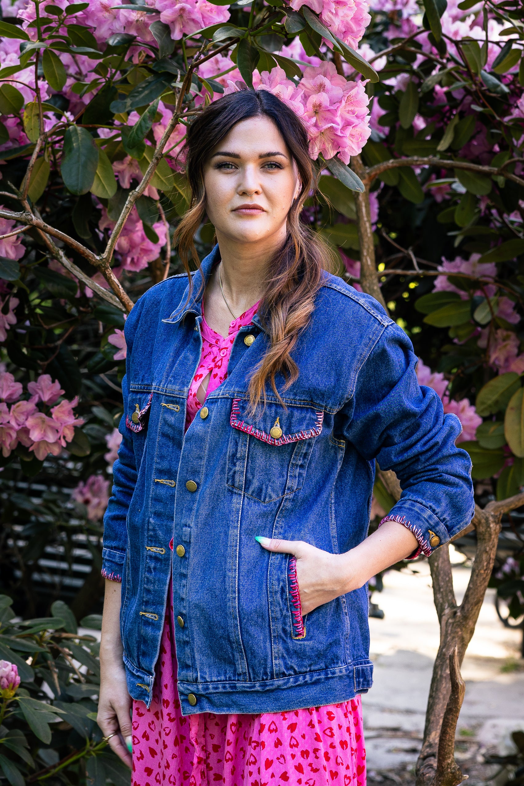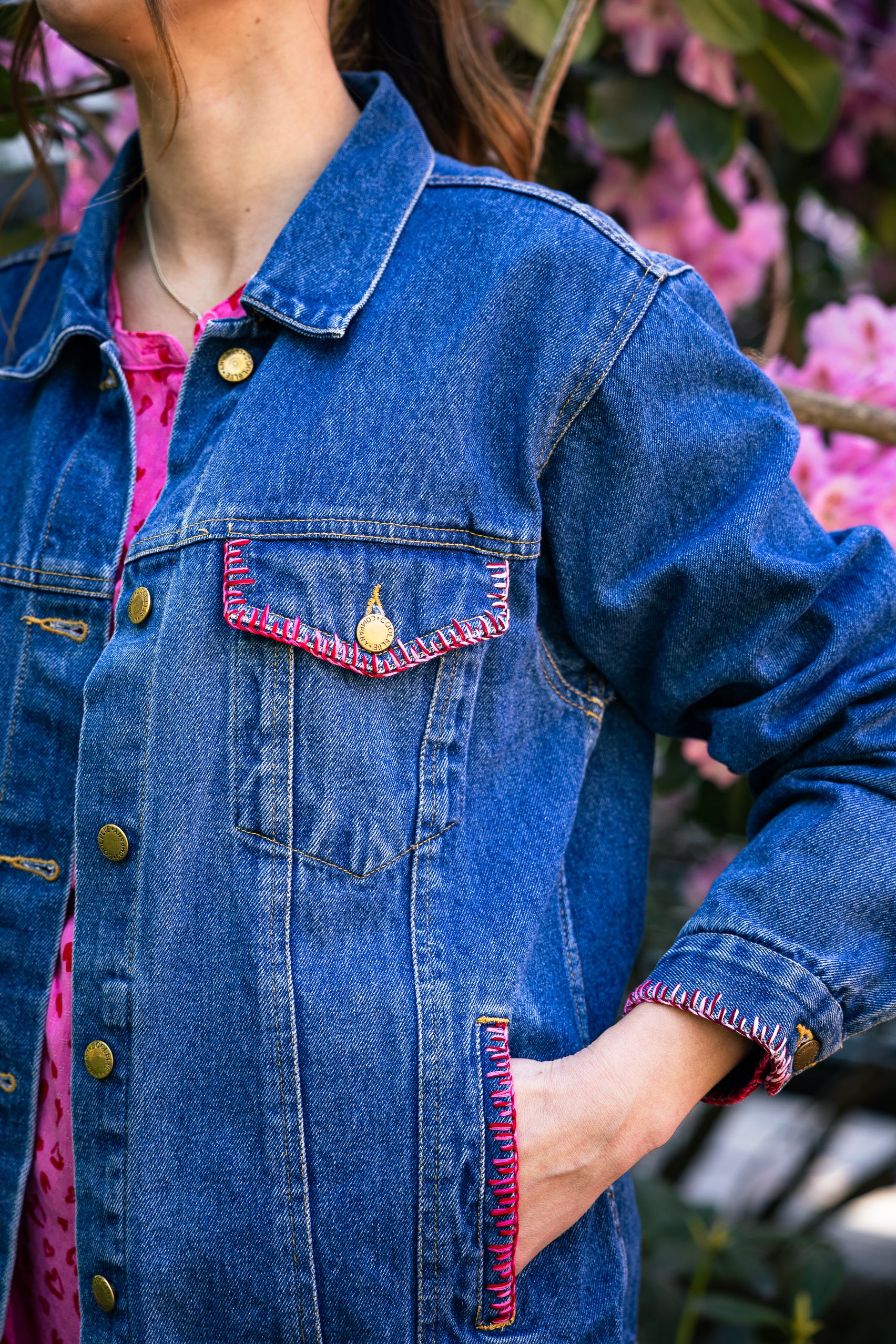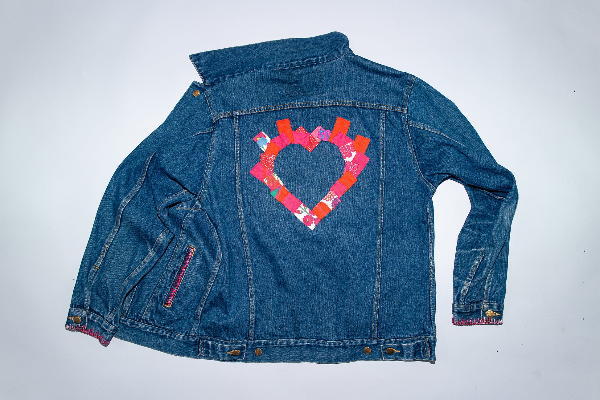 A classic straight-cut men's style, this jacket is adorned with embroideries and appliqués. On the back, small fabric pieces form a burning heart in shades of red and cerise. The pockets and sleeves are trimmed with blanket stitching in red and pink.