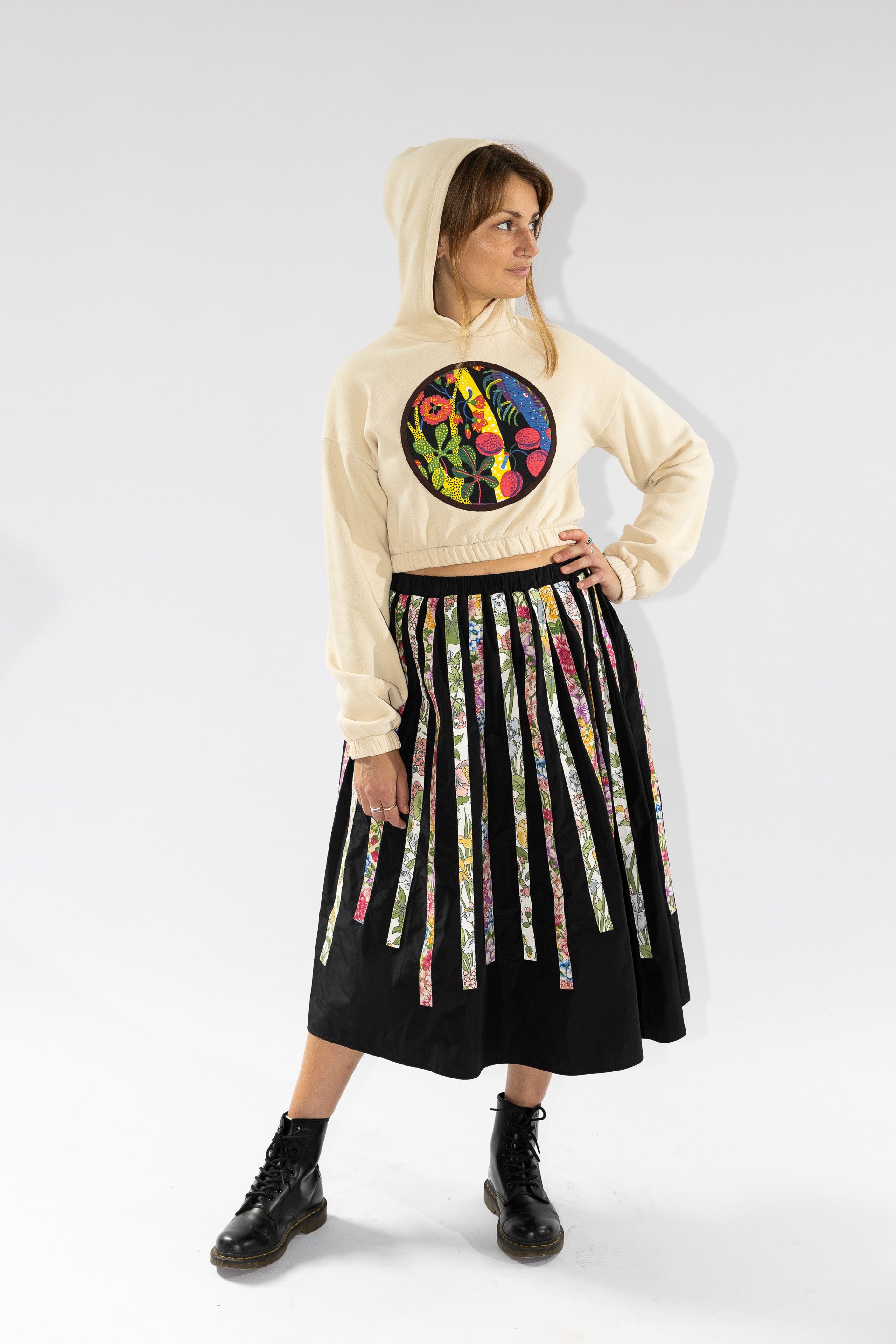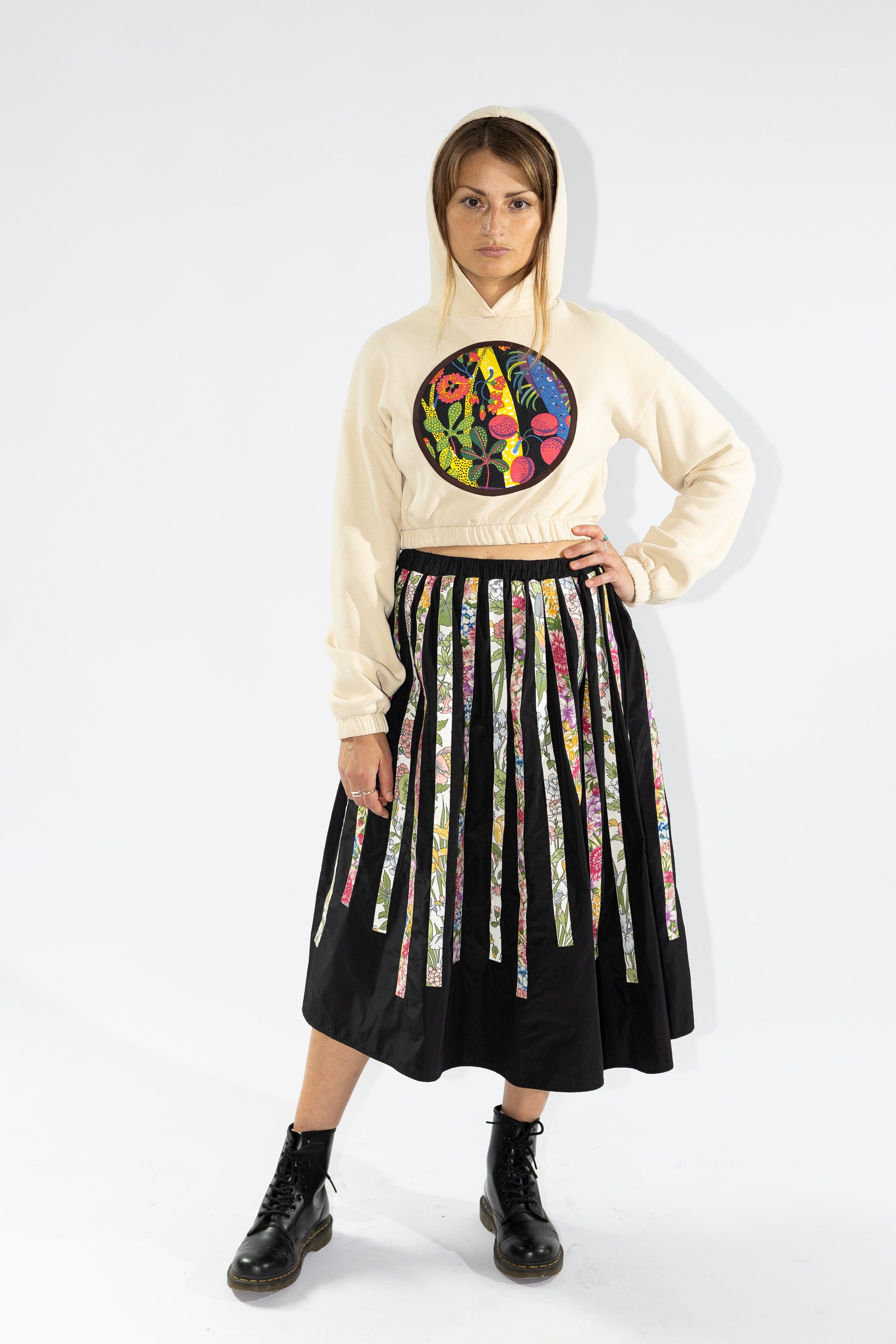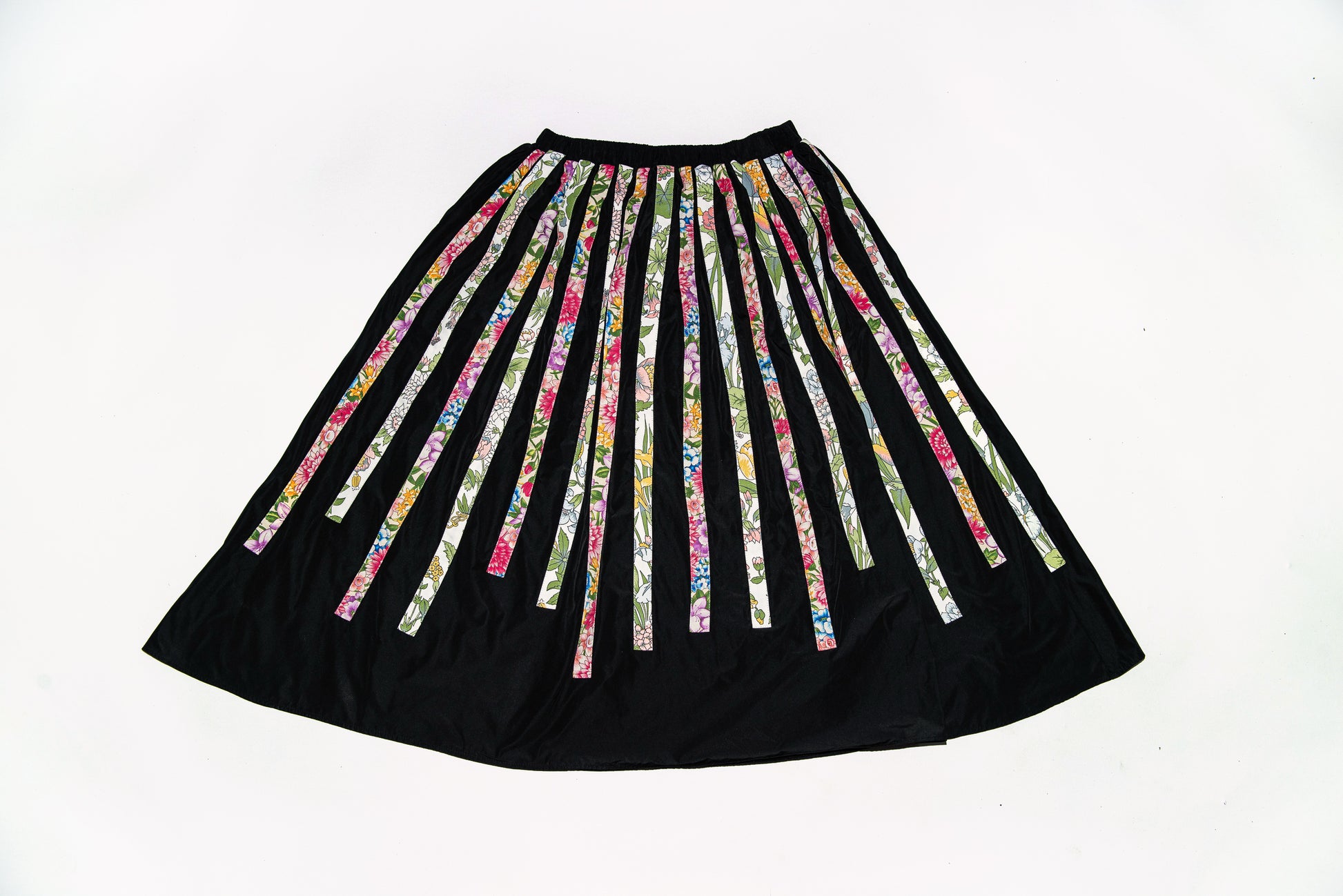 This black taffeta skirt is adorned with varying straps attached at the waist. The appliqués in floral cotton fabrics add a punch of print, making the combination playful and bold. Detailed with side pockets and an elastic waistband for comfort and practicality.