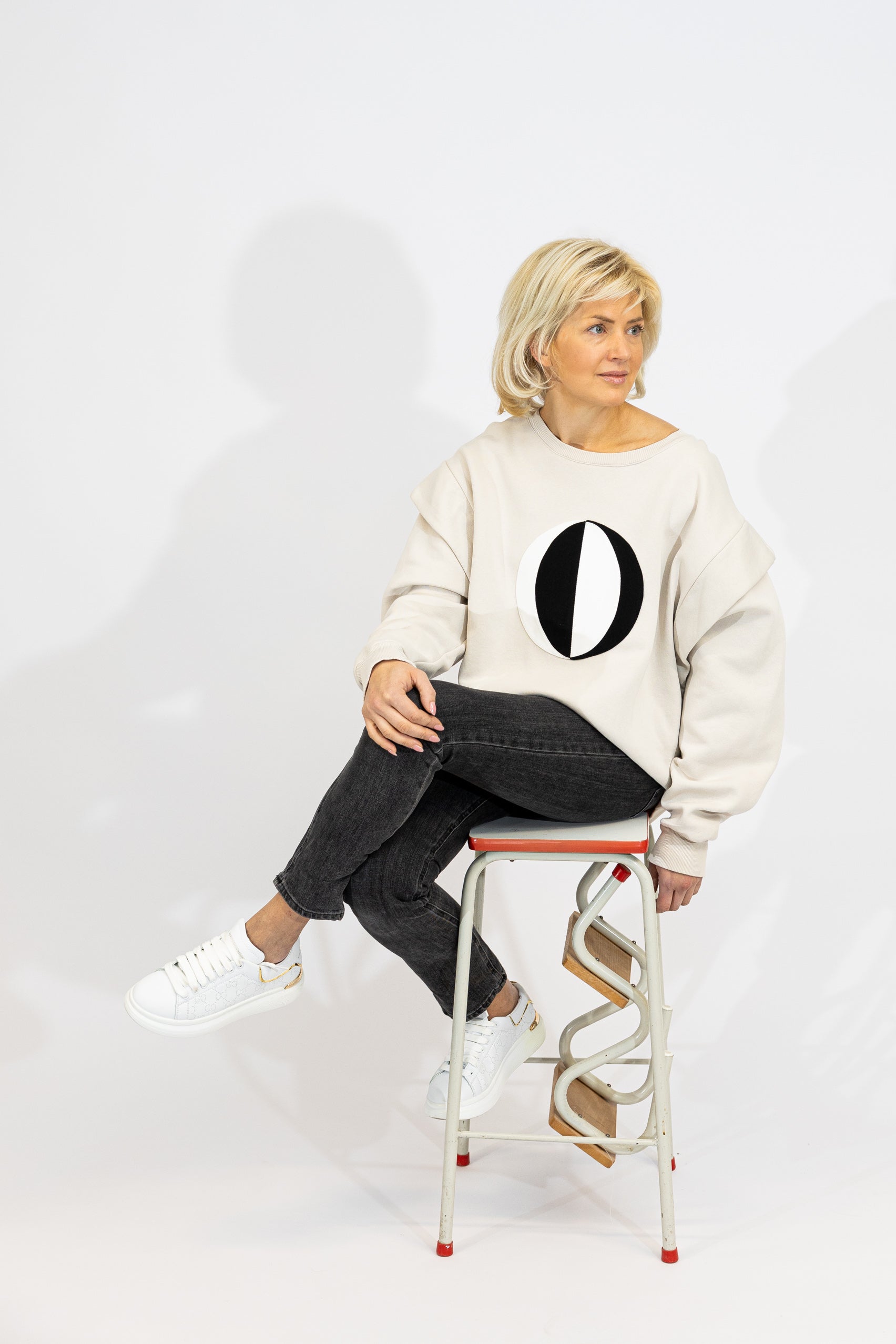 The Current Standpoint of the Mahatmas / No.2, has been used as motif for this sweatshirt. The black and white appliqué is made from contrasting denim fabrics in black and white. The sweater is beige and has a decorative extra panel over the shoulders and a straight frill. Straight model.