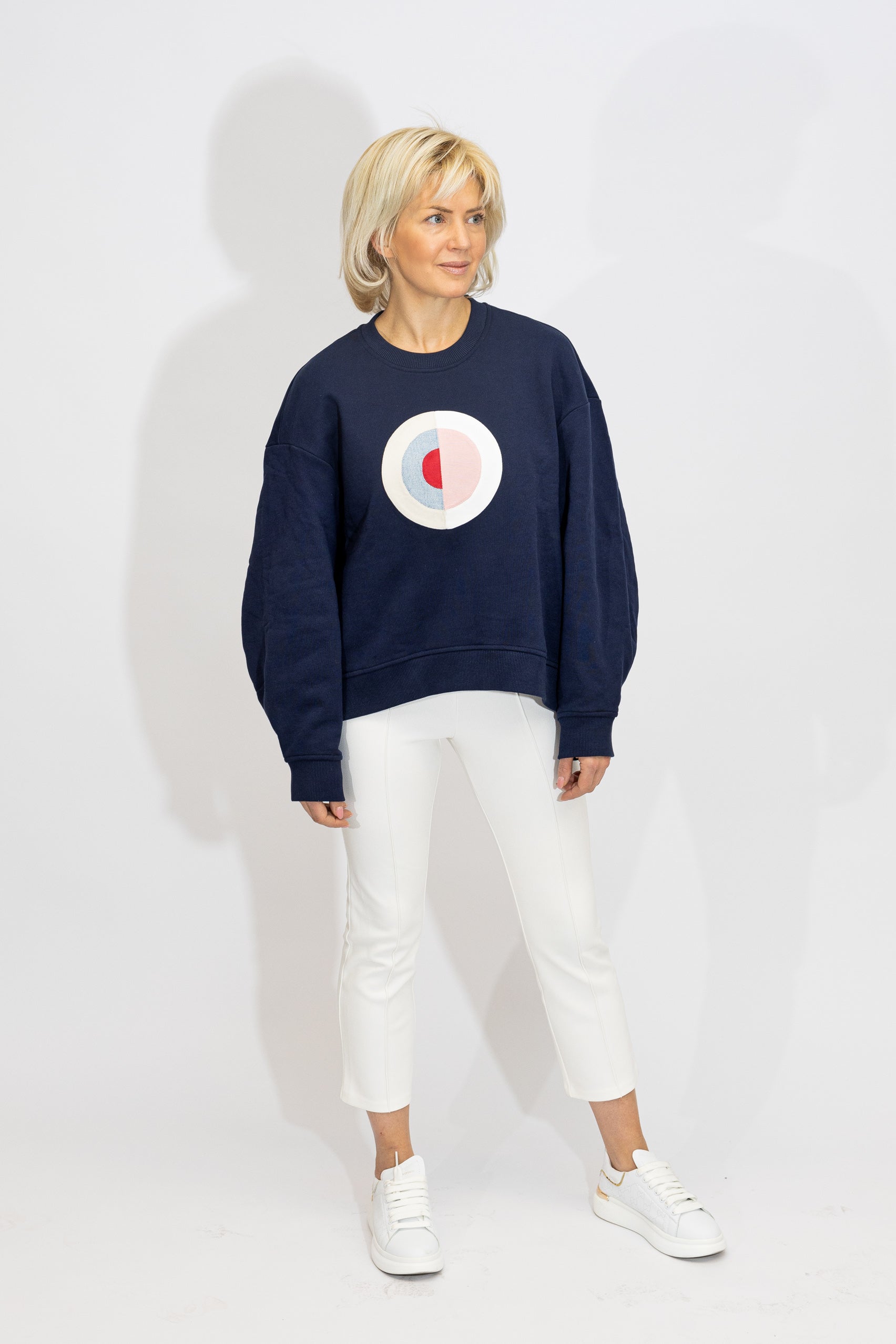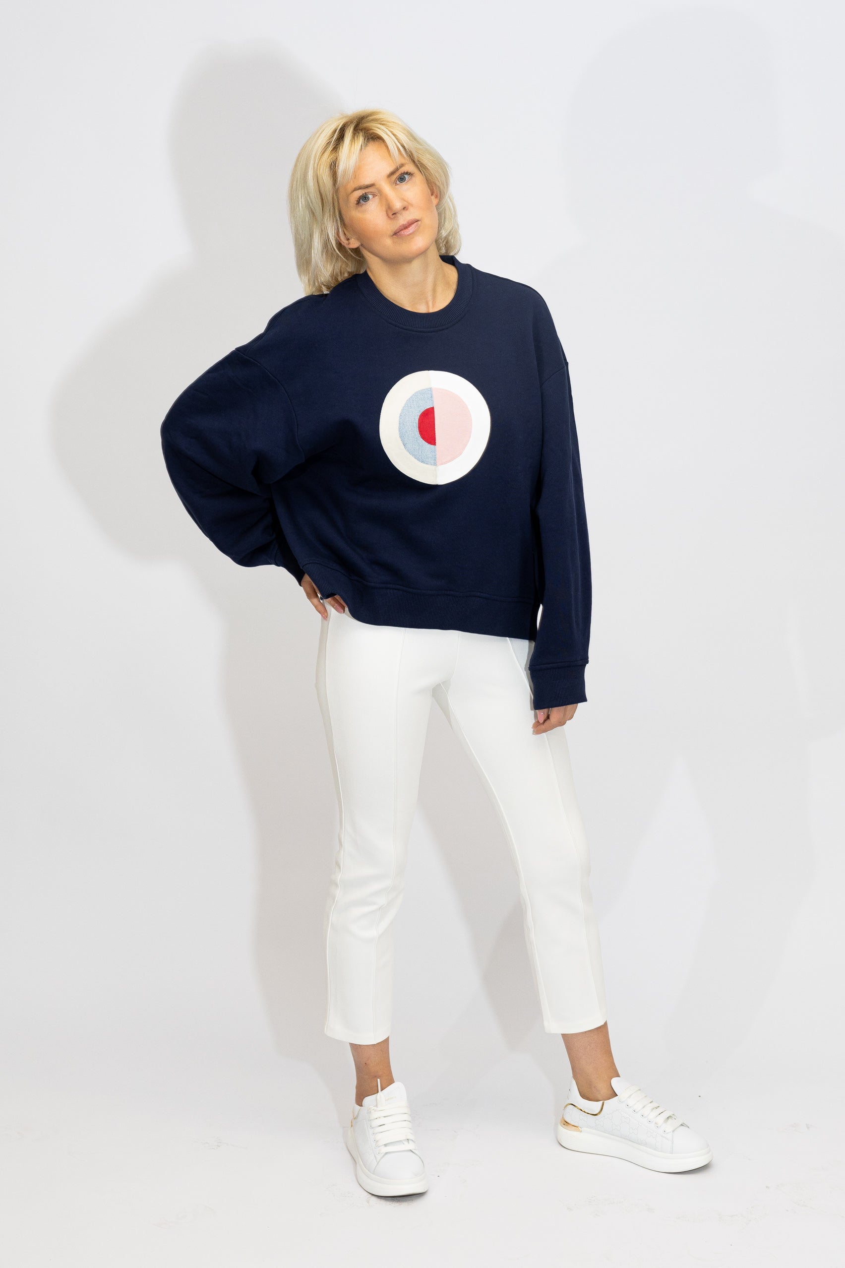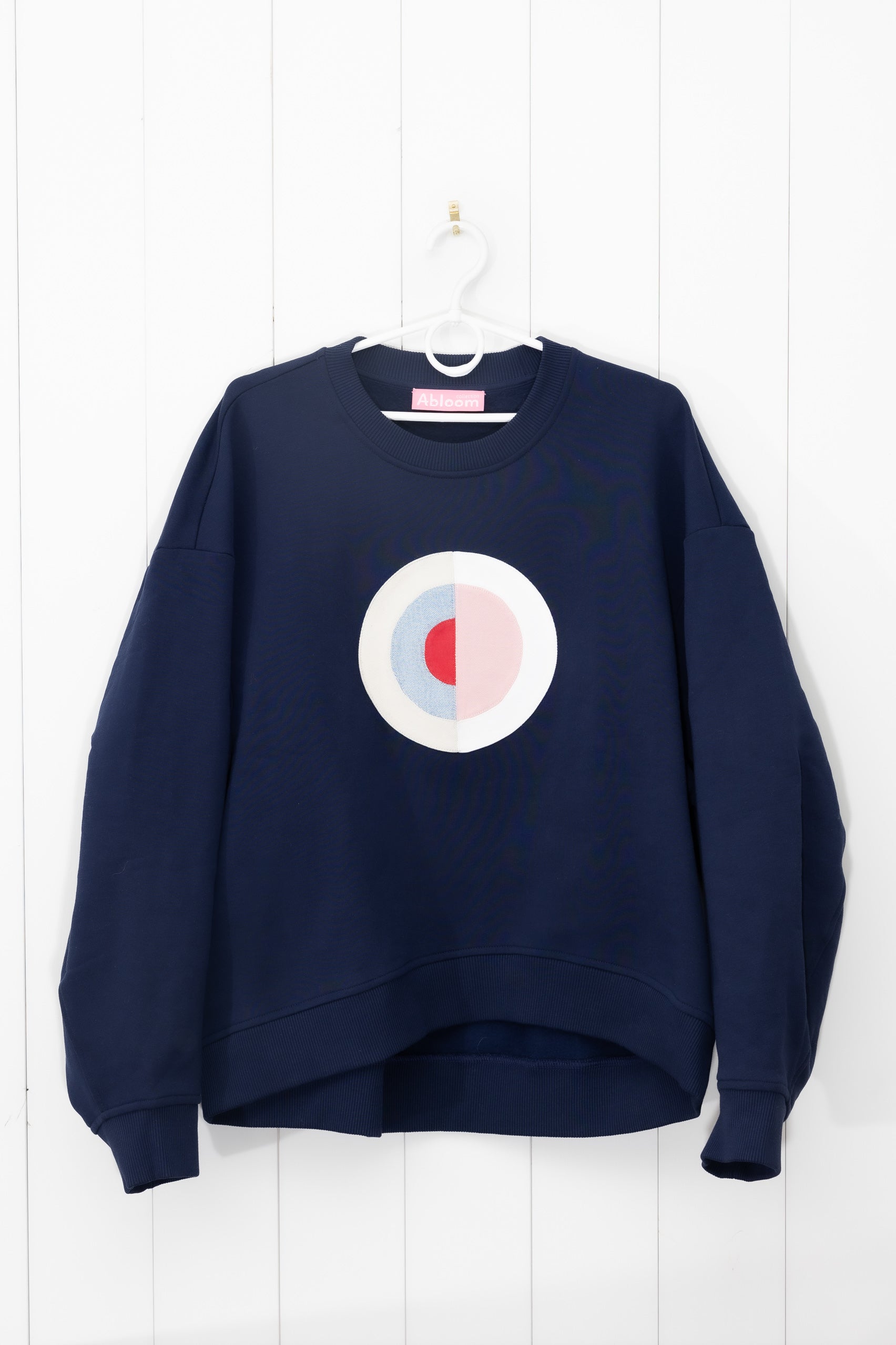Inspired by Hilma af Klint's series The Swan. The Swan No.16 with its dark background and harmonizing center has been chosen as motif. The appliqué is made from different denim fabrics. The sweater is navy blue and of an oversize model.