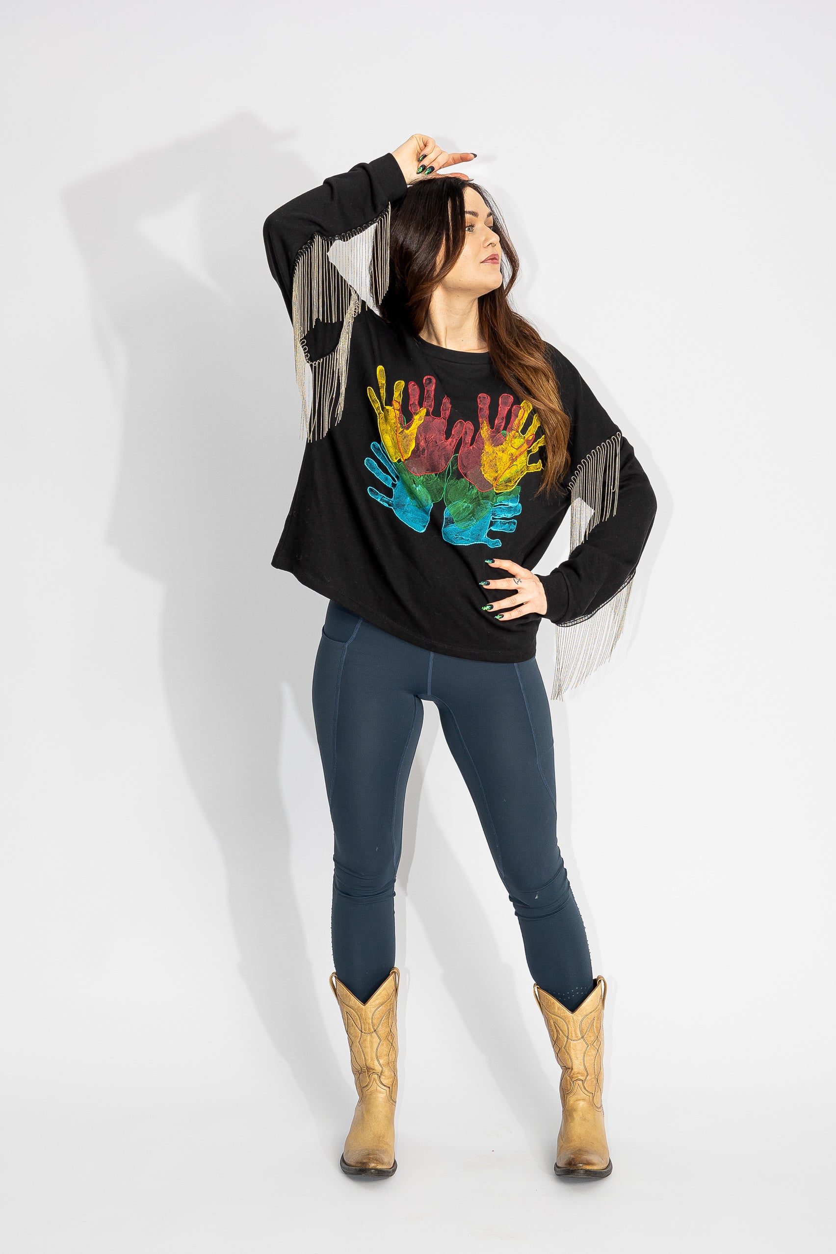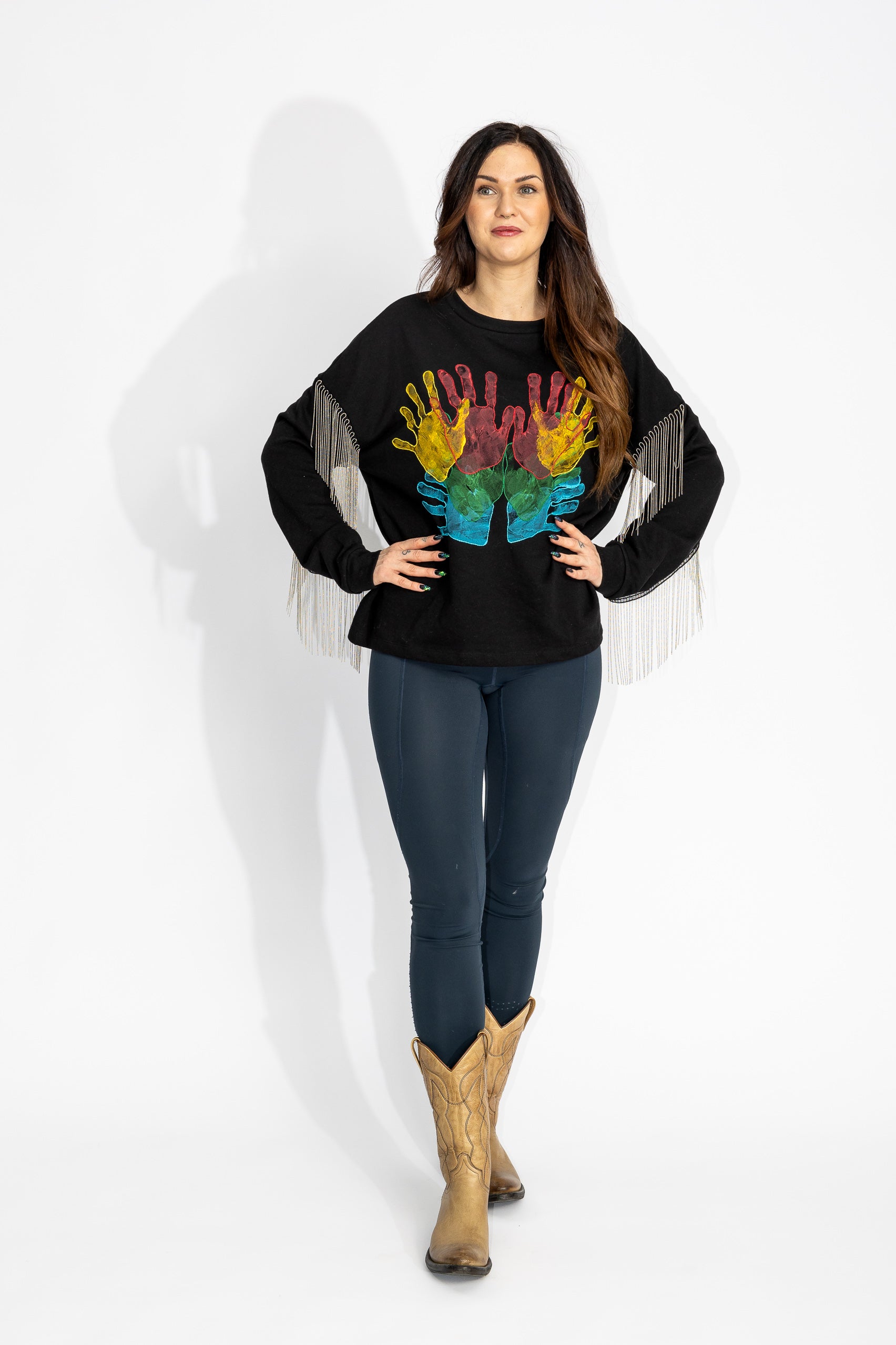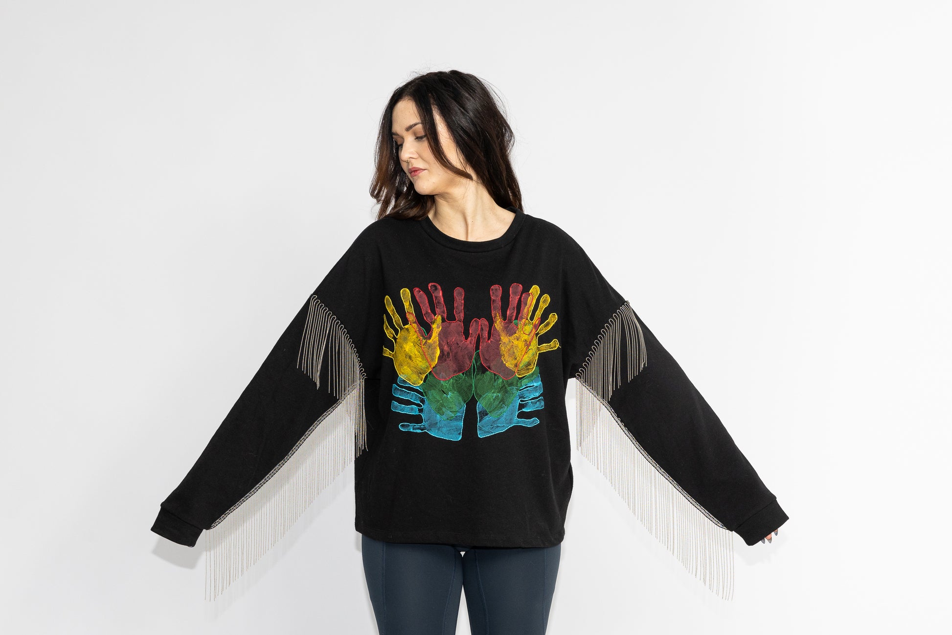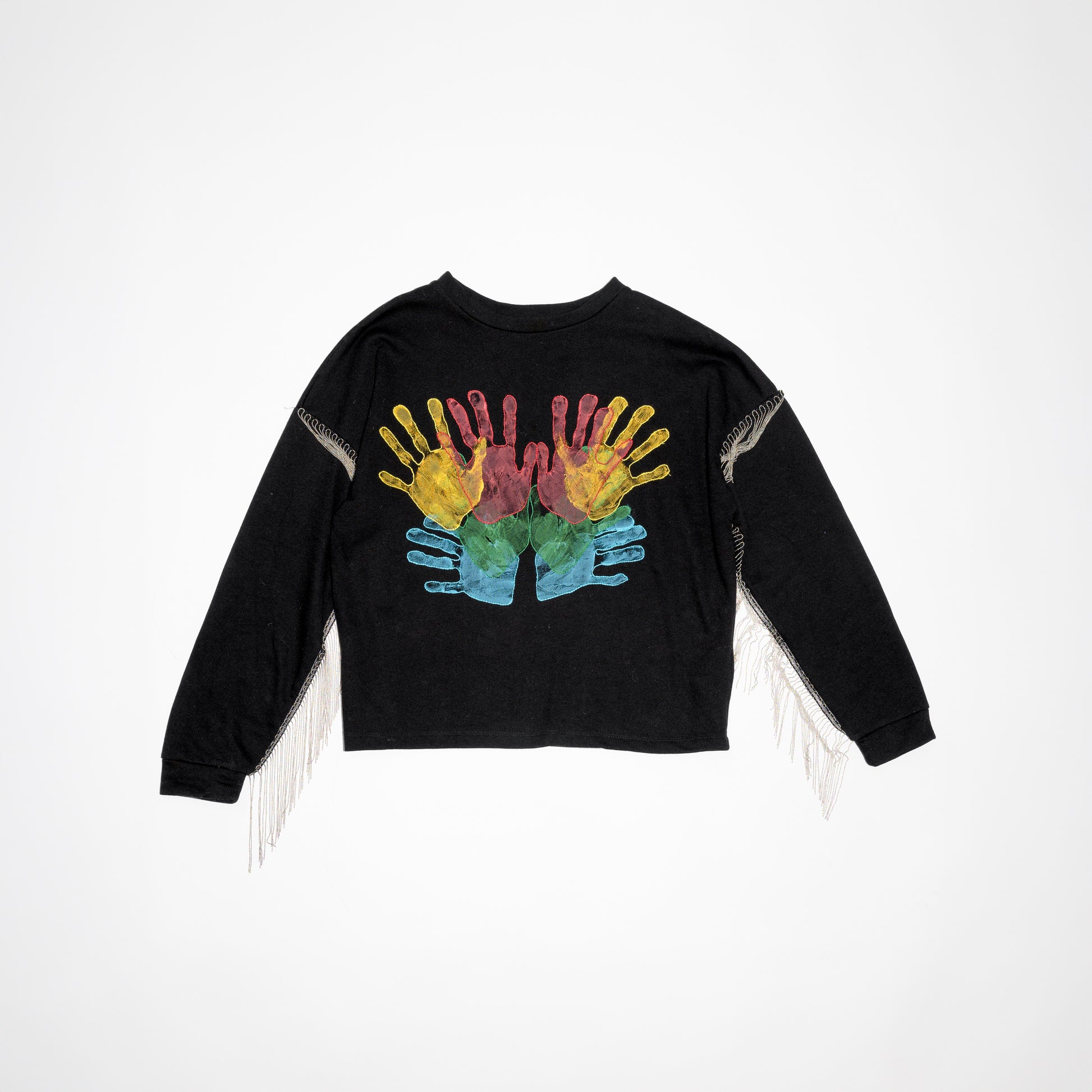 Uniquely comfortable black sweatshirt with silver/metal fringes. Hand-printed hands with fabric paint in yellow, red, green, and blue, with a hand-embroidered border in the same colors.