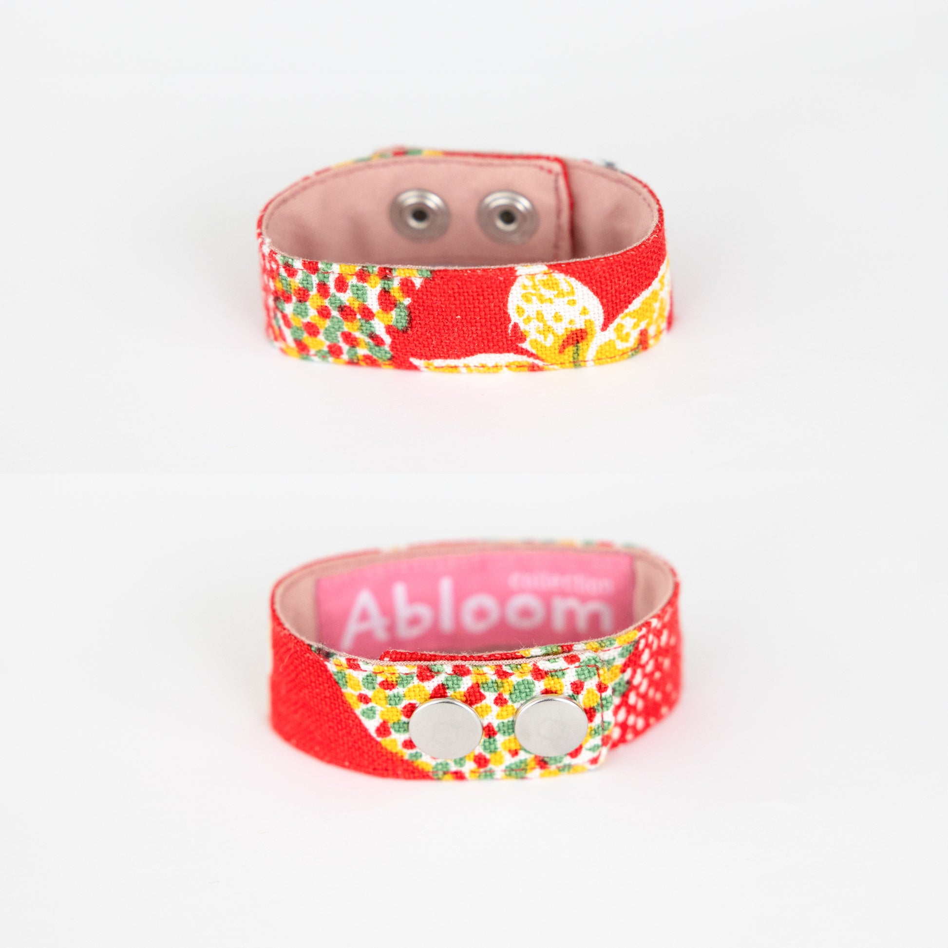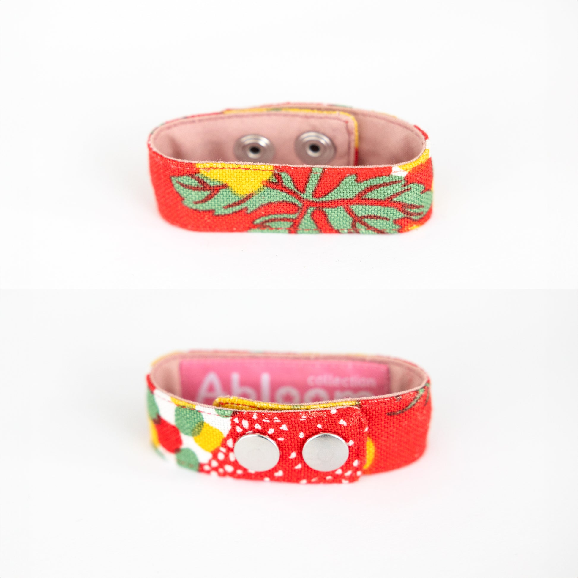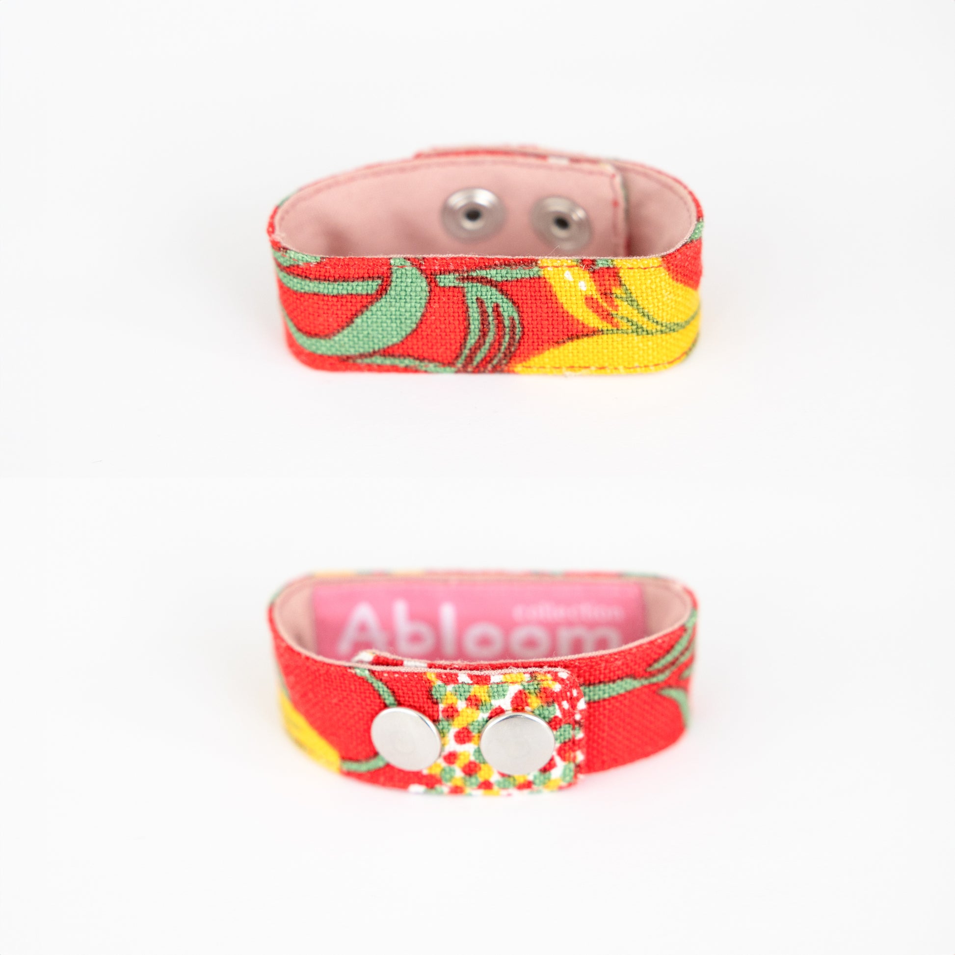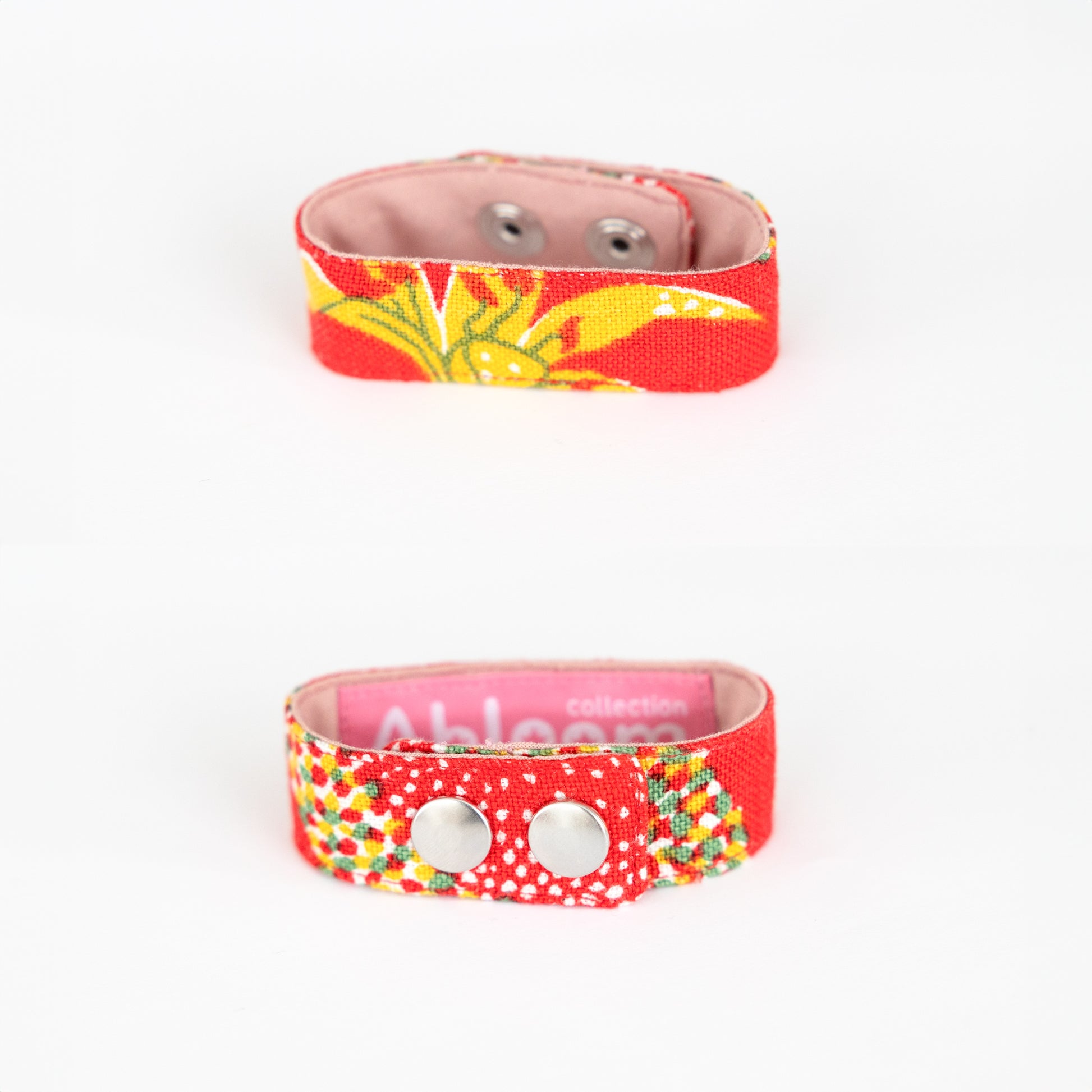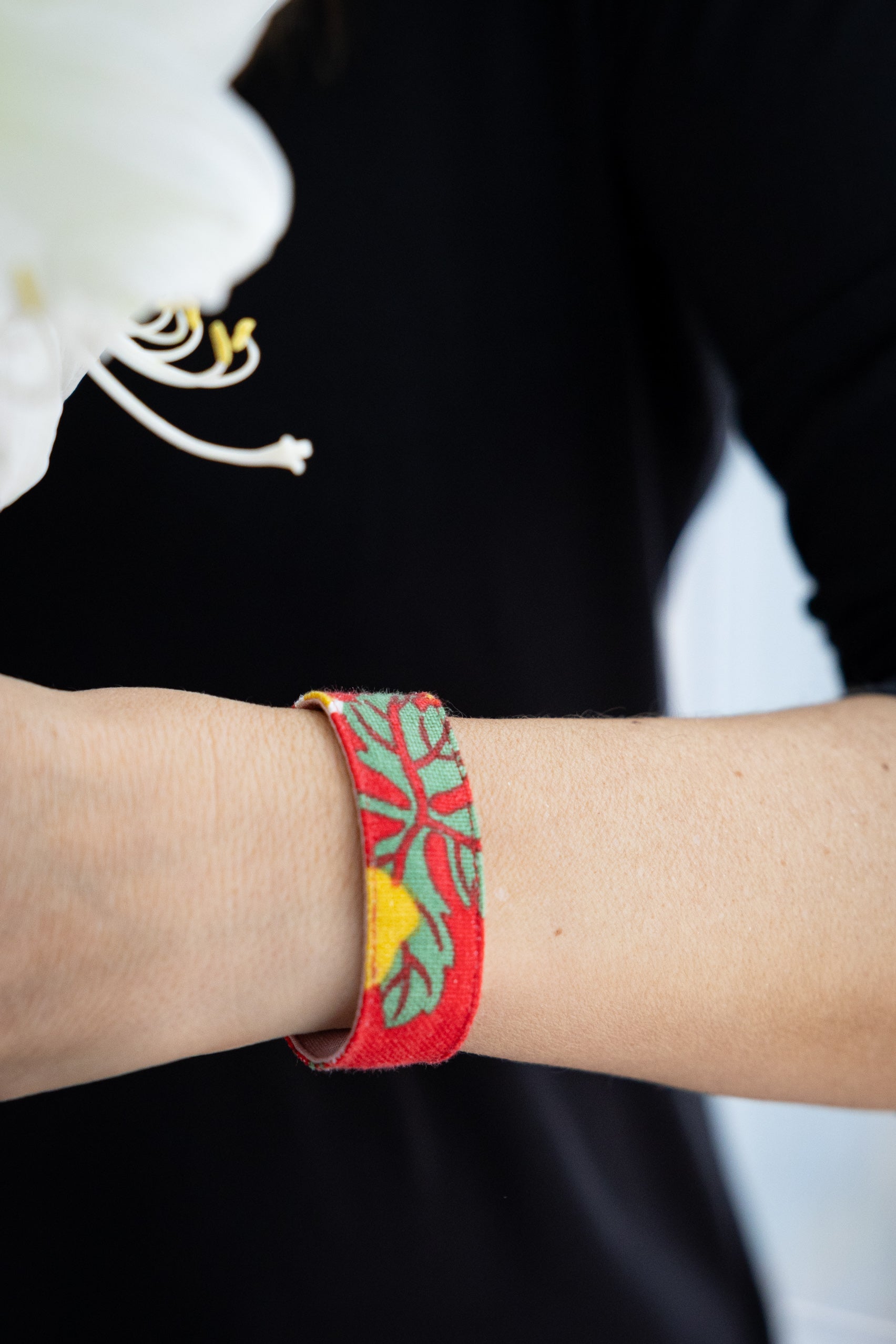 Sewn bracelet made of linen with Josef Frank's pattern Catleya. Lined with cotton fabric. Closes with two push buttons. Width approx. 2.25 cm. Circumference with both buttons buttoned 20 cm. With only the outermost button, the circumference is 21 cm.