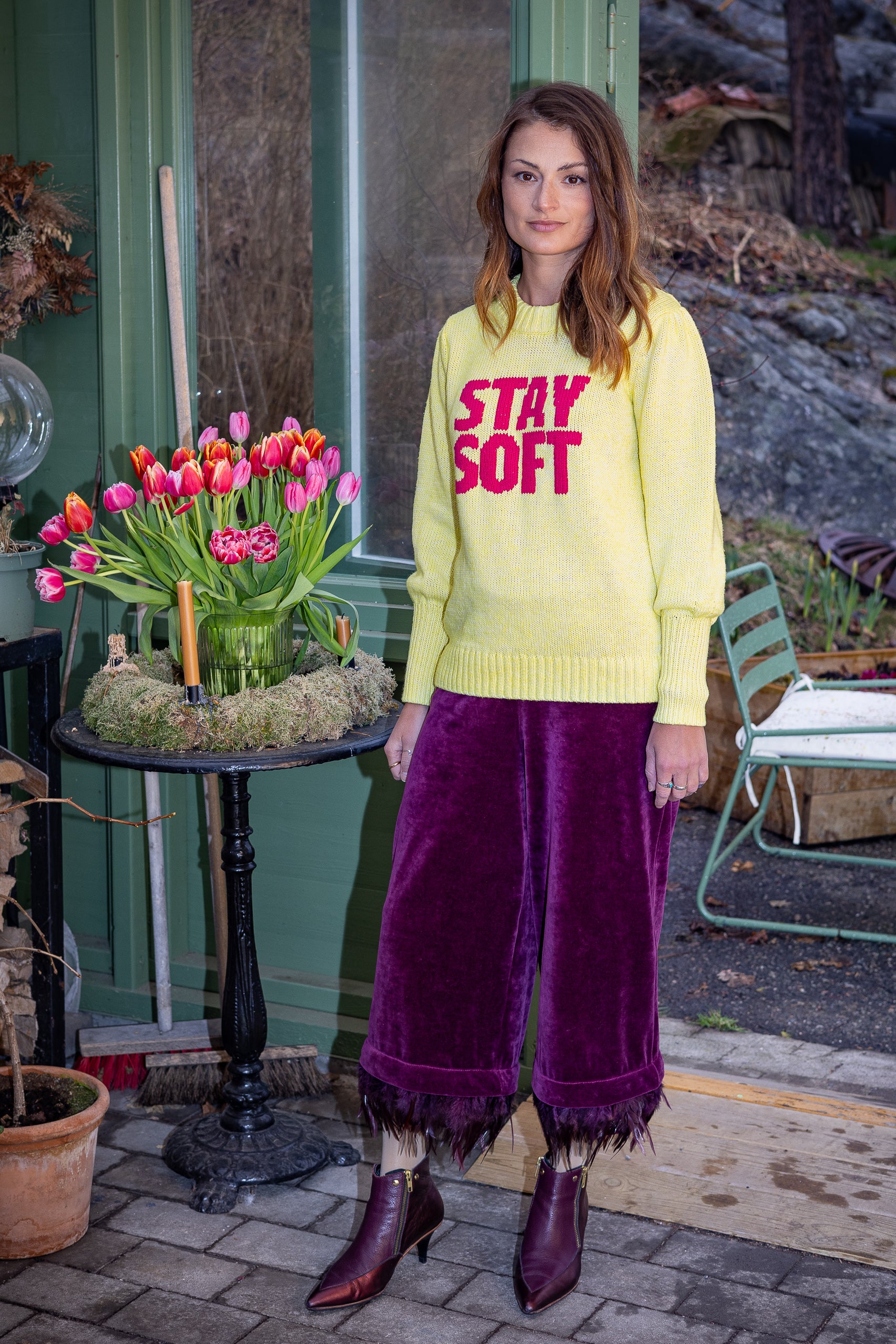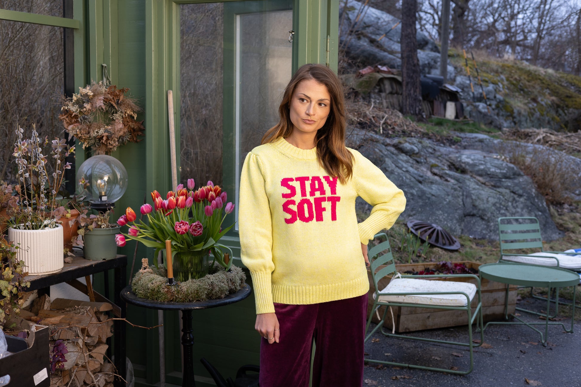 On this lovely yellow knitted sweatshirt, we have embroidered a text so that you will remember to keep the calm and softness within you no matter what happens.